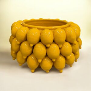 Il Vaso Limoni a 3 File è un raffinato complemento d’arredo in ceramica che esalta tutta la bellezza e la vivacità della tradizione siciliana. La decorazione, caratterizzata da tre file di limoni modellati in rilievo e dipinti a mano, crea un effetto scenografico ricco e armonioso, capace di catturare lo sguardo.